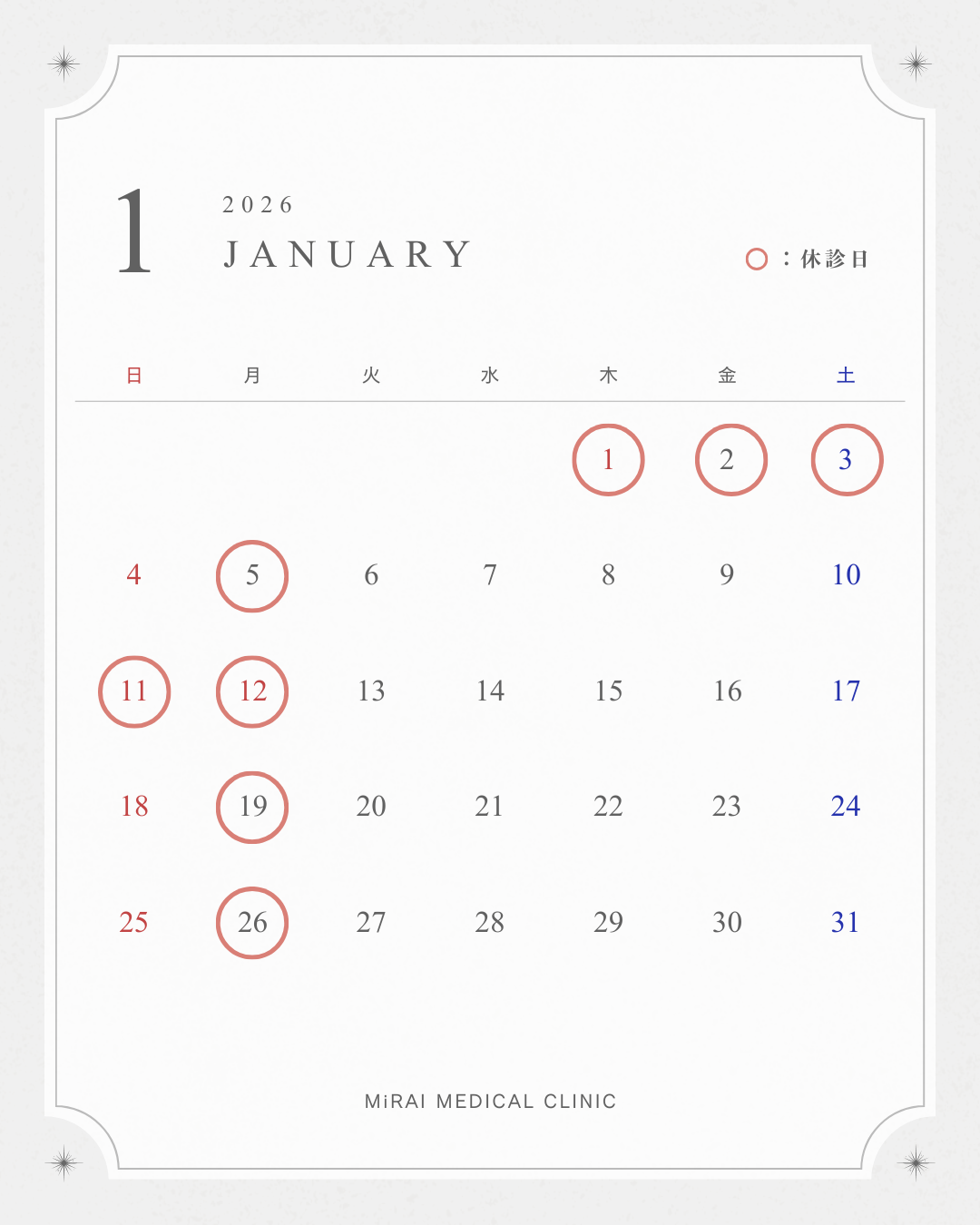 1/1(木)、1/2(金)、1/3(土)、1/5(月)、1/11(日)、1/12(月)、1/19(月)、1/26(月)