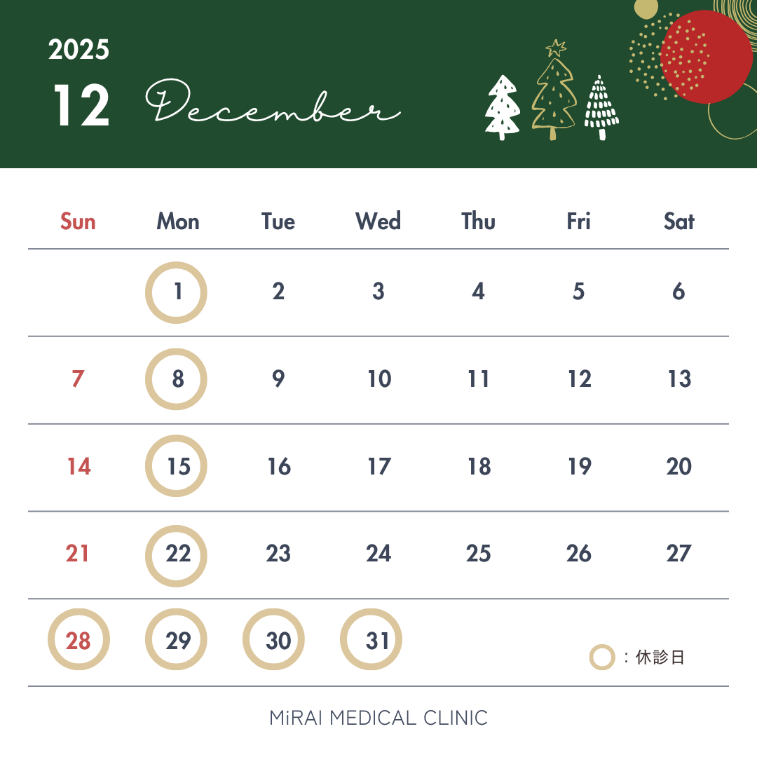 12/1(月)、12/8(月)、12/15(月)、12/22(月)、12/28(日)、12/29(月)、12/30(火)、12/31(水)