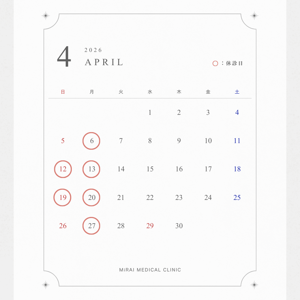 4/6(月)、4/12(日)、4/13(月)、4/19(日)、4/20(月)、4/27(月)